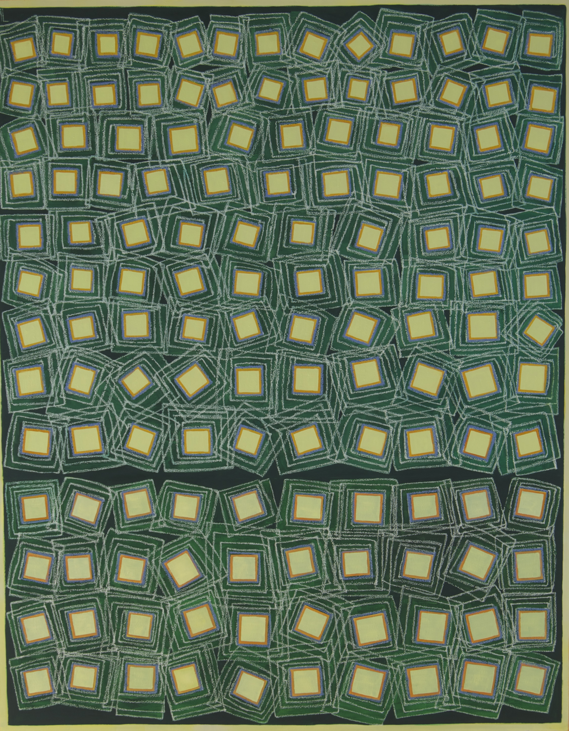 YELLOW SQUARES ON GREEN oil and oil bar on linen 84" x 66"
